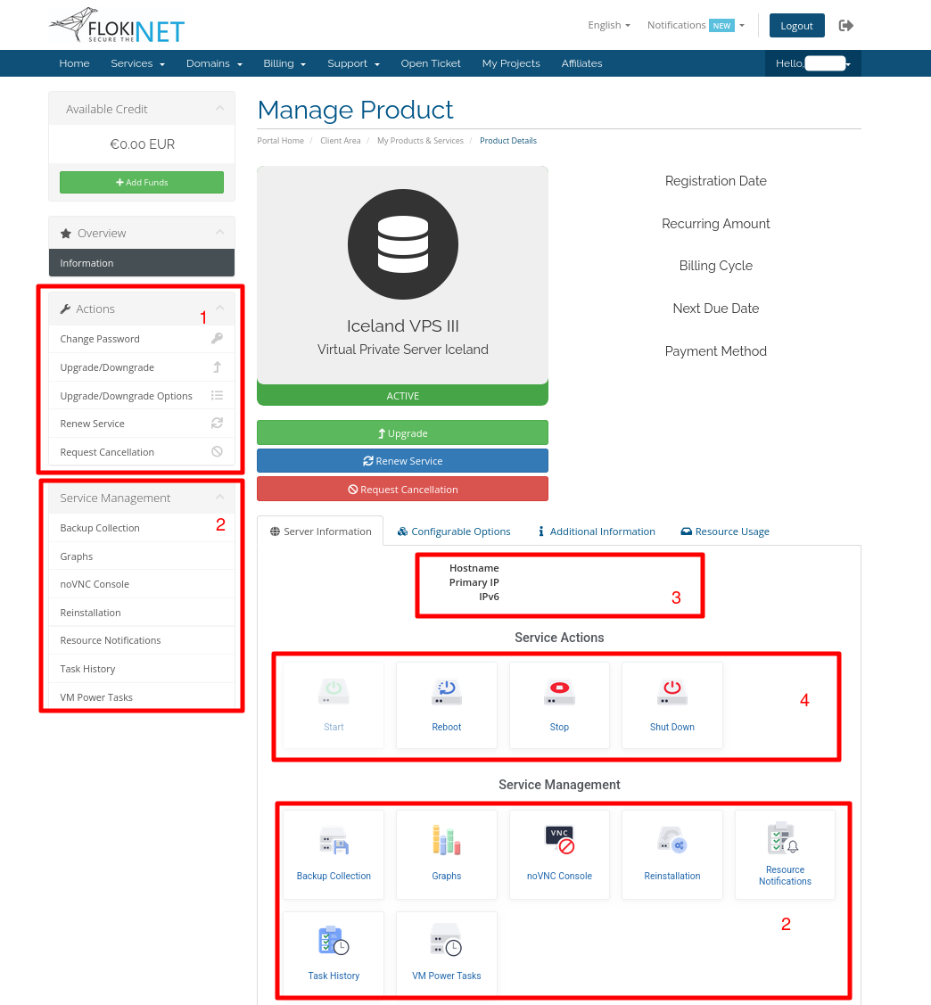 Once the order has been paid for and the virtual server has been provisioned, you will find it listed in your FlokiNET account Client Area > My Products & Services > Product Details